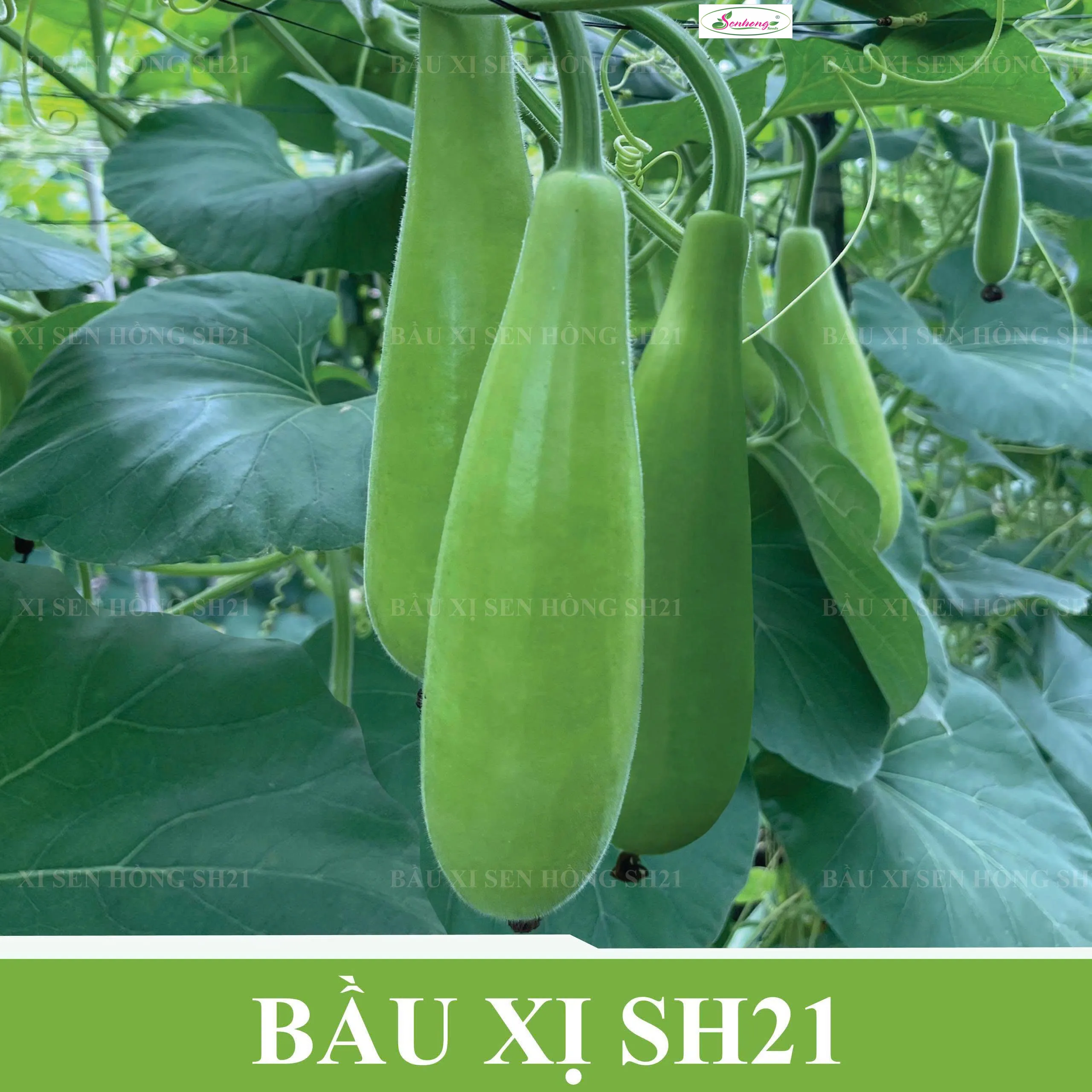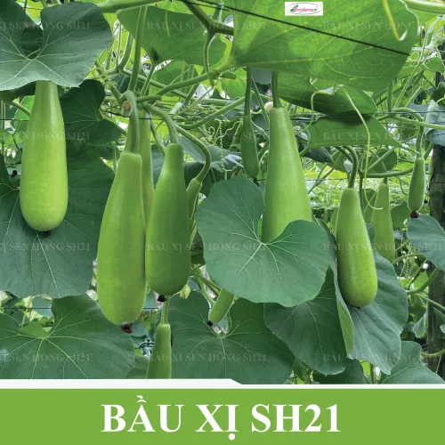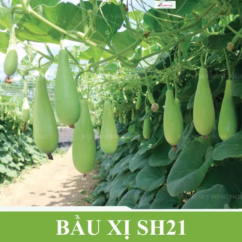"BẦU XỊ SH21" của công ty Sen Hồng có các đặc điểm chính sau: + Đặc tính giống: Cây sinh trưởng, phát triển rất khỏe, kháng bệnh tốt đặc biệt là kháng chết cây. trái rộ và rất dễ đậu, da xanh bóng, ruột đặc, ăn ngọt và thơm. + Mật độ: - Bò giàn: Cây x cây: 0,6-0,8m; Hàng x hàng: 6-7m. Lượng giống: 4-5 gói/1000m2. - Bò đất: Cây x cây: 0,6-0,8m; Hàng x hàng: 8-9m. Lượng giống: 3-4 gói/1000m2. + Thu hoạch: 45-48 ngày sau gieo, năng suất 10-15kg/cây. + Thời vụ: Quanh năm.