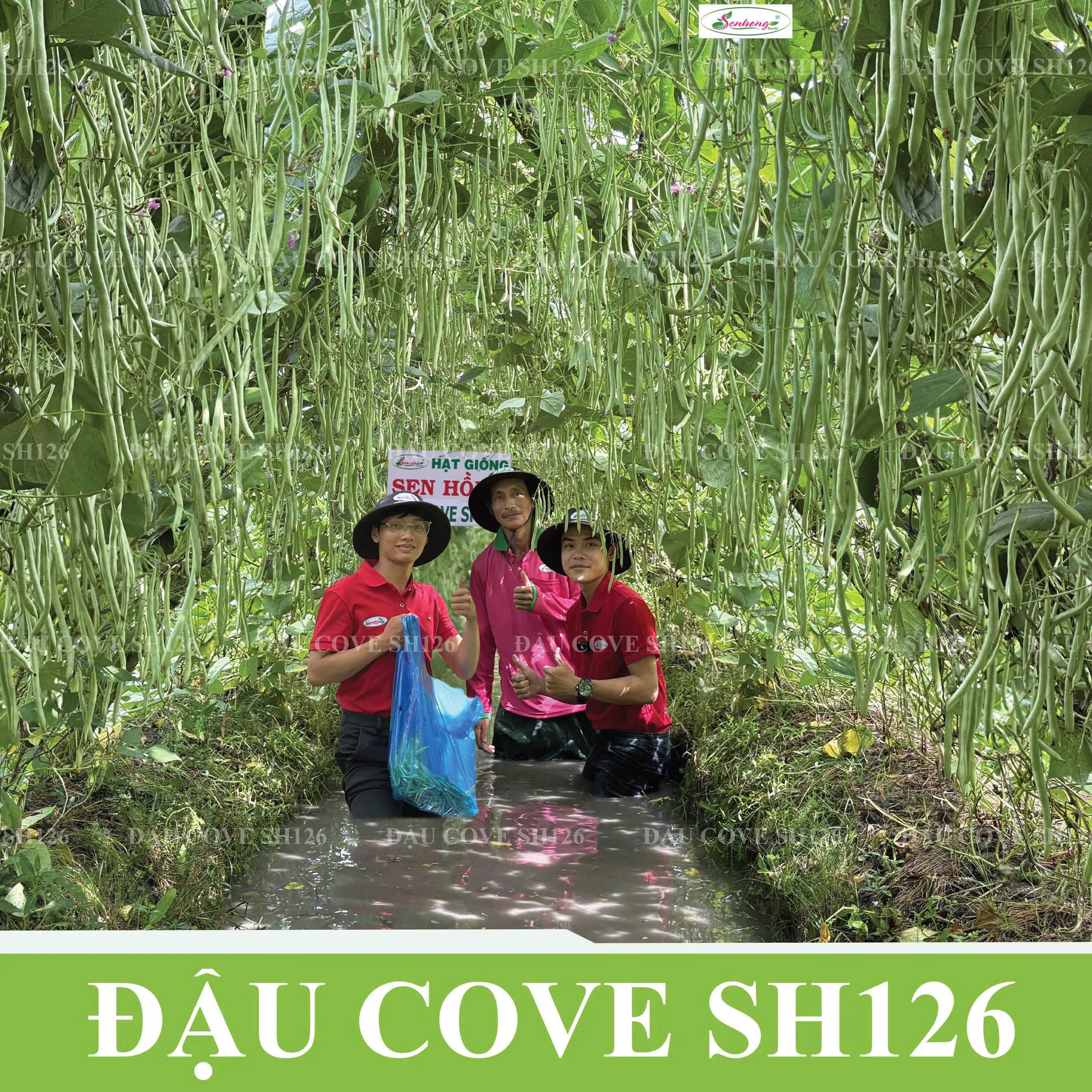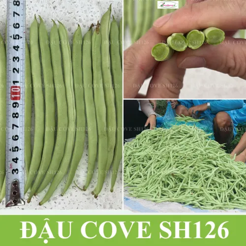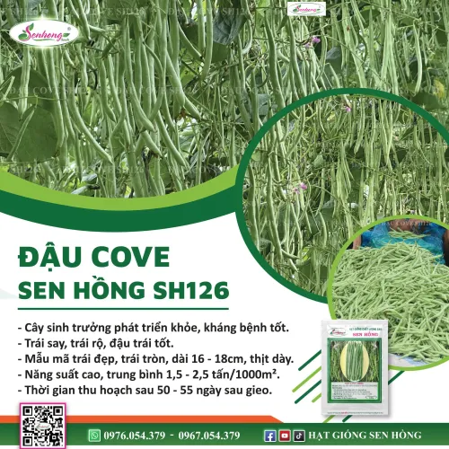 "ĐẬU COVE SH126" của Công ty HẠT GIỐNG SEN HỒNG có các đặc điểm chính sau: + Đặc tính giống: Cây sinh trưởng khỏe, kháng bệnh tốt, năng suất cao. Trái dài 16-18cm, da xanh trung bình, thịt dày, hạt sen nhỏ. + Mật độ cây trồng: Cây x cây: 20-25 cm; Hàng x hàng: 0,5-0,6m. + Lượng giống: 2-3kg/1000m2. + Thu hoạch: 50-55 ngày sau gieo.