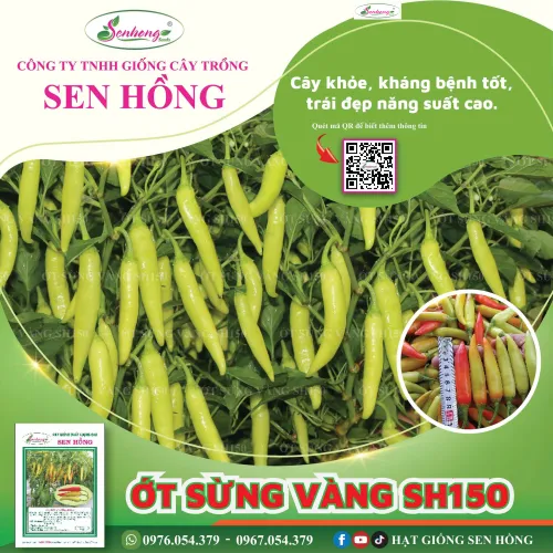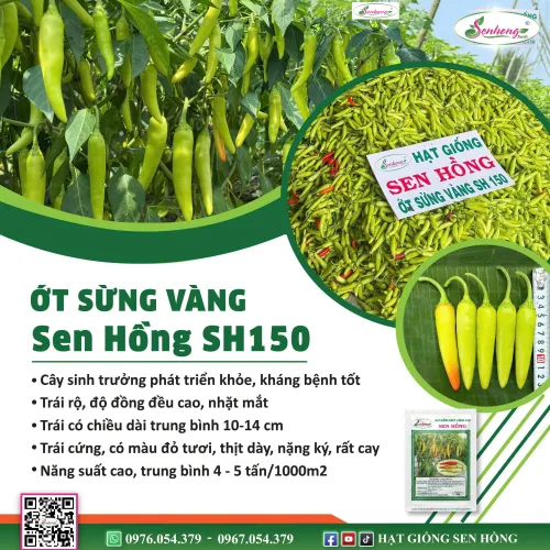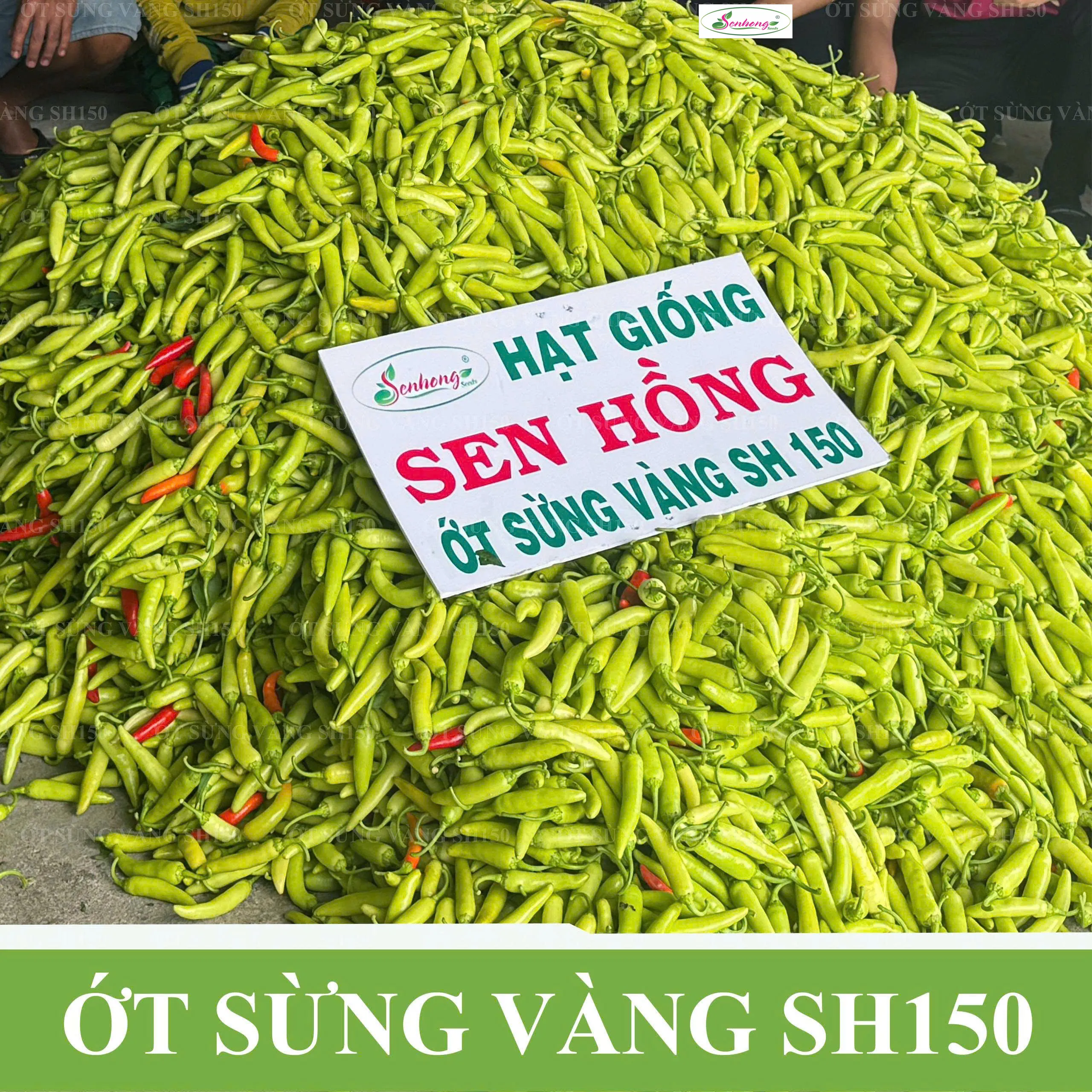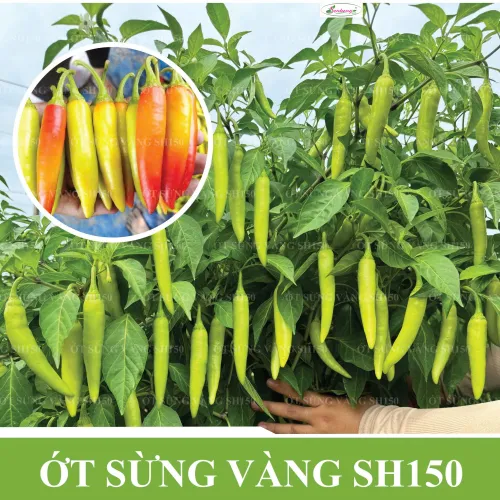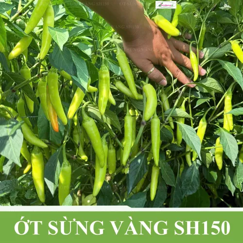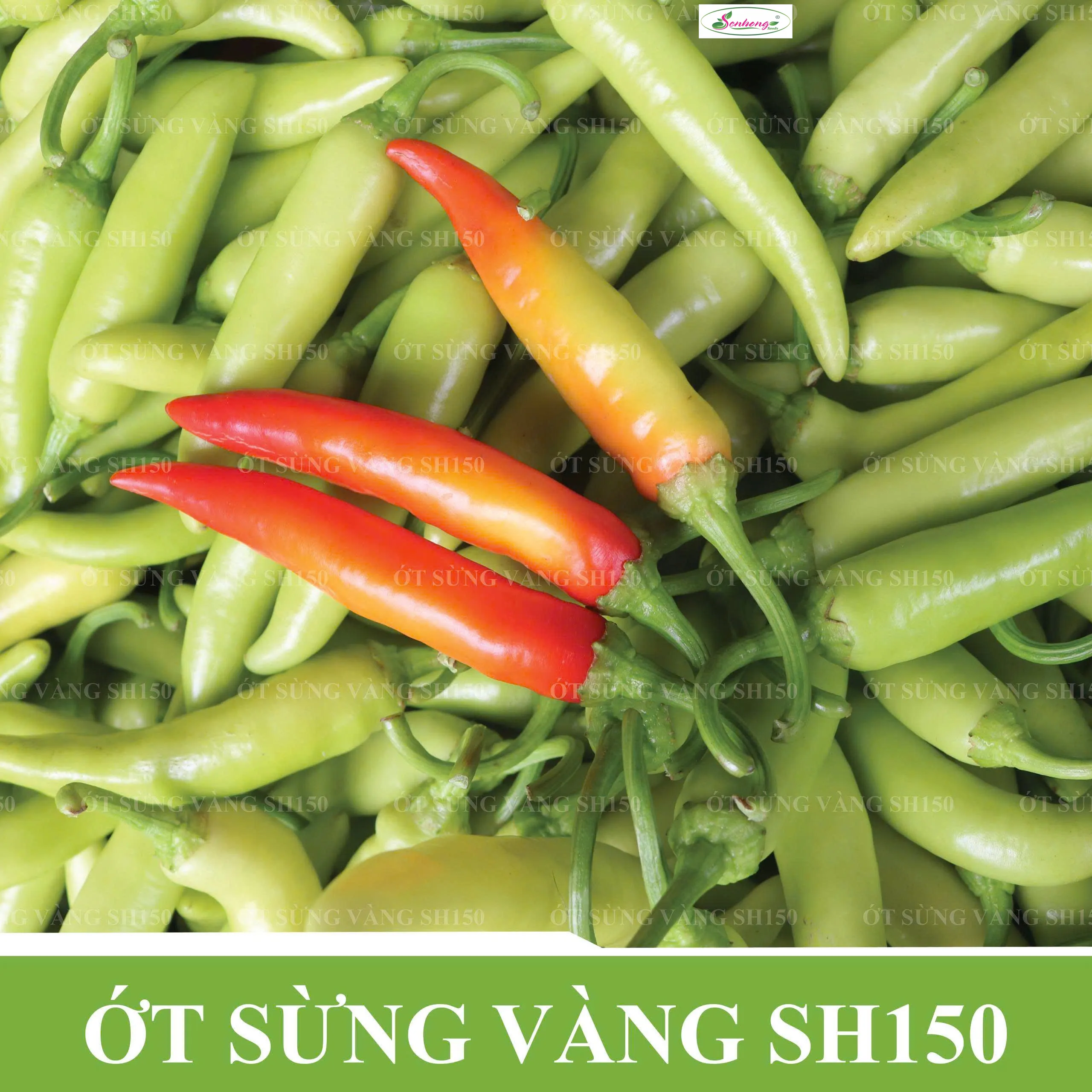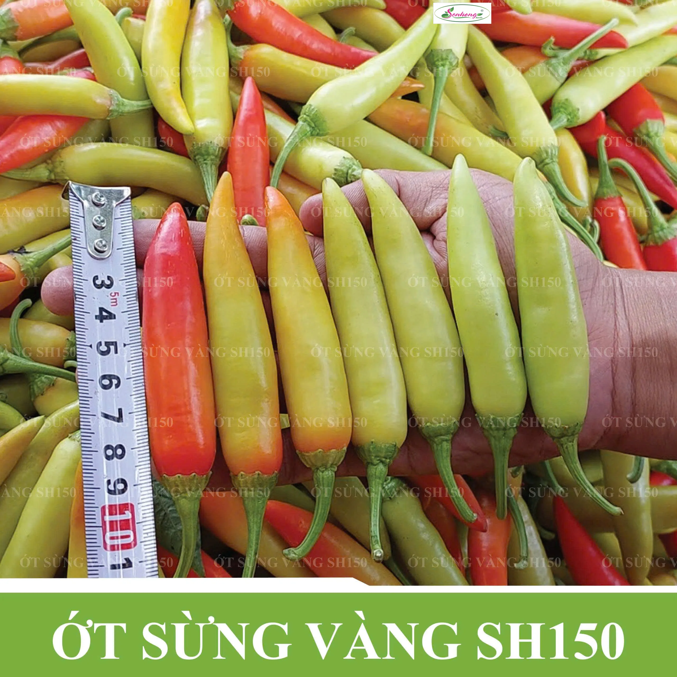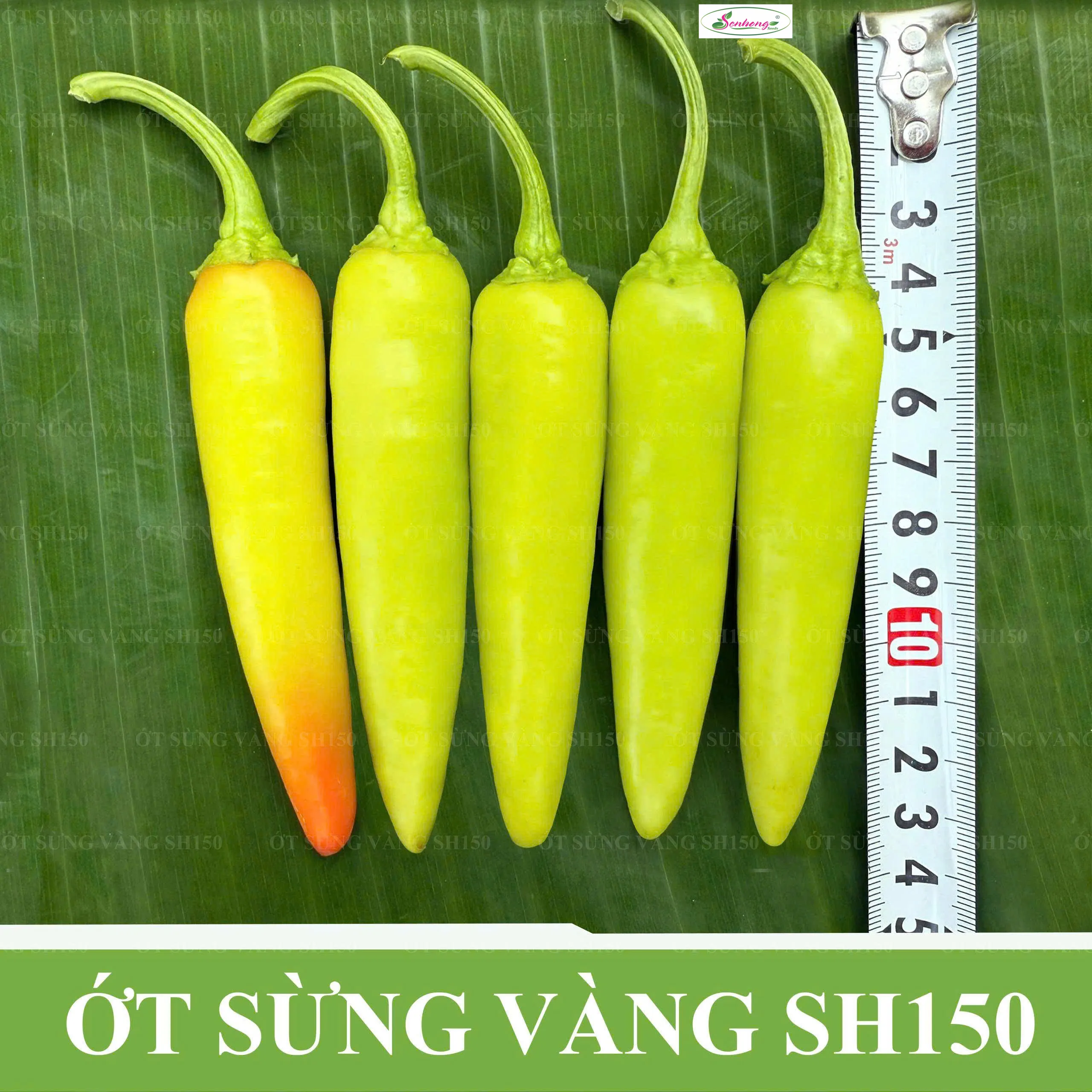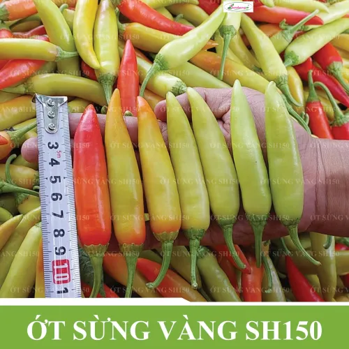 * Đặc Tính Giống: Hạt giống ớt sừng vàng SH 150 có đặc tính giống là cây phát triên khỏe, kháng bệnh tốt. trái dài 10-14cm, khi chưa chín màu xanh hơi vàng, già chuyển màu vàng cam, trái chín màu đỏ, thịt dày, rất cay